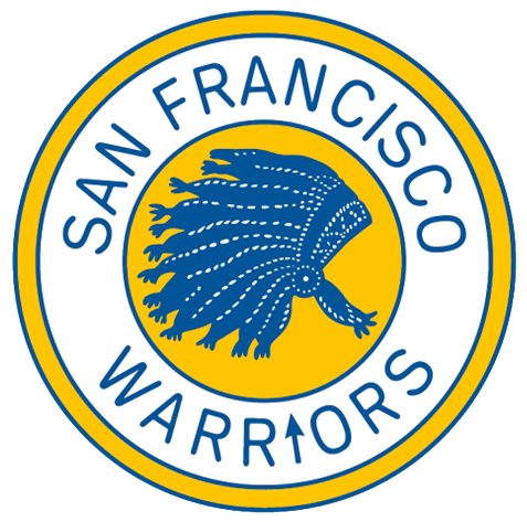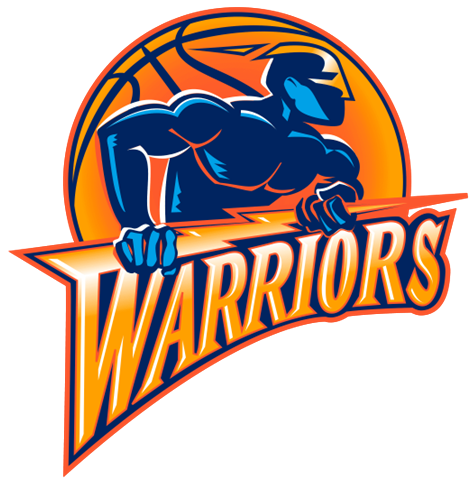 队徽的主角是一位卡通化的美洲原住民在打篮球(这造型明明是足球好么)的形象。黄色手签式的“Warriors”斜跨画面中心。