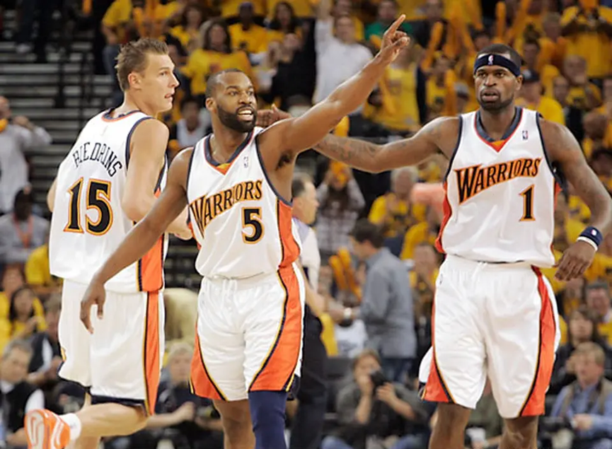 金州勇士队(Golden State Warriors),1946年成立于宾夕法尼亚州费城,当时名为费城勇士(Philadelphia Warriors);1962年,西迁至加利福尼亚州旧金山,改称旧金山勇士(San Francisco Warriors);1971年,搬迁至奥克兰,并改称金州勇士(Golden State Warriors)至今。勇士是NBA(BAA)资历最老的球队之一,与凯尔特人、尼克斯是唯三至今犹存的创始球队。